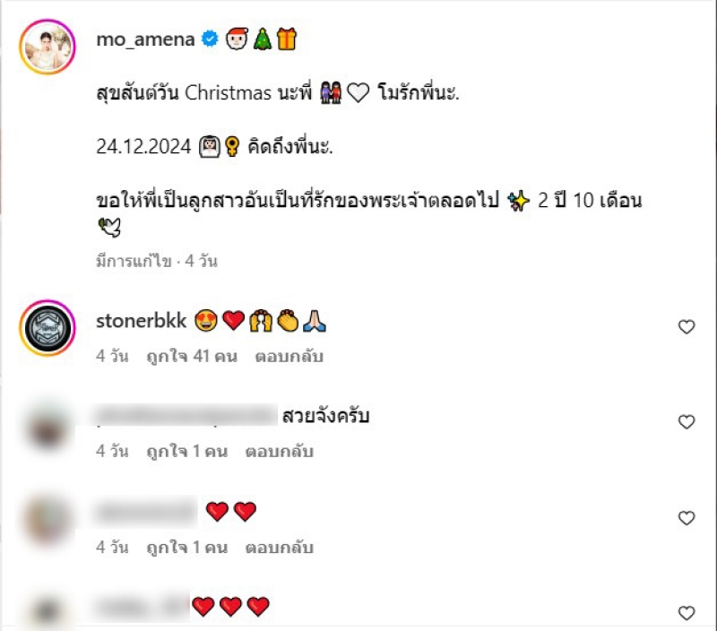 เรียกได้ว่า เป็นเพื่อนของ แตง โมนิดา อีกคนหนึ่ง อย่าง โม อมีนา ที่คอยไปหาอยู่บ่อยๆ ล่าสุดโมก็ได้ไปหาแตงโมในวันคริสต์มาส พร้อมเผยภาพและระบุแคปชั่นว่า สุขสันต์วัน Christmas นะพี่ โมรักพี่นะ. 24.12.2024 คิดถึงพี่นะ. ขอให้พี่เป็นลูกสาวอันเป็นที่รักของพระเจ้าตลอดไป 2 ปี 10 เดือน