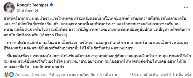 ที่ผมต้องชี้แจง เพราะผมไม่อยากให้แฟนคลับของเราทุกคนต้องอยู่กับความคลุมเครือครับ ขอบคุณทุกคนที่ยังรักผม แต่ผมจะดีขึ้นและรักตัวเองให้ได้ ผมจะพยายามอย่างมาก ผมไม่อยากให้พาดพิงถึงฝ่ายไหนเลย อยากให้มันจบลงตรงนี้ครับ .. ผมเจ็บมากพอแล้ว