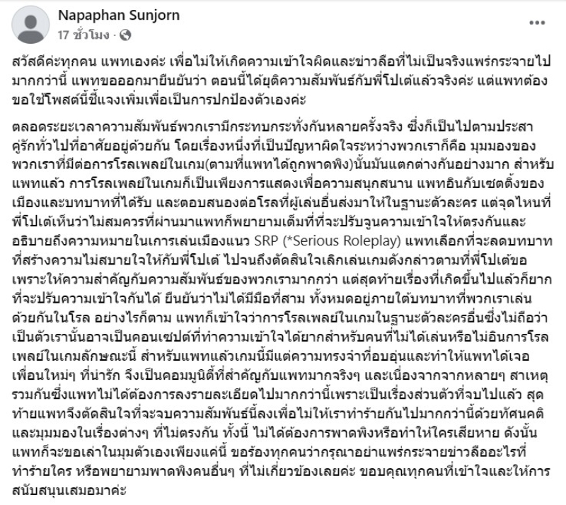 แต่สุดท้ายเรื่องที่เกิดขึ้นไปแล้วก็ยากที่จะปรับความเข้าใจกันได้ ยืนยันว่าไม่ได้มีมือที่สาม ทั้งหมดอยู่ภายใต้บทบาทที่พวกเราเล่นด้วยกันในโรล อย่างไรก็ตาม แพทก็เข้าใจว่าการโรลเพลย์ในเกมในฐานะตัวละครอื่นซึ่งไม่ถือว่าเป็นตัวเรานั้นอาจเป็นคอนเซปต์ที่ทำความเข้าใจได้ยากสำหรับคนที่ไม่ได้เล่นหรือไม่อินการโรลเพลย์ในเกมลักษณะนี้ สำหรับแพทแล้วเกมนี้มีแต่ความทรงจำที่อบอุ่นและทำให้แพทได้เจอเพื่อนใหม่ๆ ที่น่ารัก จึงเป็นคอมมูนิตี้ที่สำคัญกับแพทมากจริงๆ และเนื่องจากจากหลายๆ สาเหตุรวมกันซึ่งแพทไม่ได้ต้องการลงรายละเอียดไปมากกว่านี้เพราะเป็นเรื่องส่วนตัวที่จบไปแล้ว สุดท้ายแพทจึงตัดสินใจที่จะจบความสัมพันธ์นี้ลงเพื่อไม่ให้เราทำร้ายกันไปมากกว่านี้ด้วยทัศนคติและมุมมองในเรื่องต่างๆ ที่ไม่ตรงกัน ทั้งนี้ ไม่ได้ต้องการพาดพิงหรือทำให้ใครเสียหาย ดังนั้นแพทก็จะขอเล่าในมุมตัวเองเพียงแค่นี้ ขอร้องทุกคนว่ากรุณาอย่าแพร่กระจายข่าวลืออะไรที่ทำร้ายใคร หรือพยายามพาดพิงคนอื่นๆ ที่ไม่เกี่ยวข้องเลยค่ะ ขอบคุณทุกคนที่เข้าใจและให้การสนับสนุนเสมอมาค่ะ
