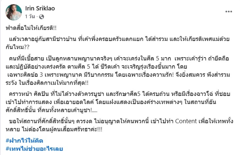 เรียกได้ว่า มีประเด็นเดือดอีกแล้ว เมื่อล่าสุดนัดร้องตัวแม่ อย่าง เปิ้ล ไอริณ ได้ออกมาโพสต์ฟาดผ่านfacebook ของ Irin Sriklao ว่า ฟาดสื่อไม่ให้เกียรติ!! แล้วเวลาอยู่กับสามีชาวบ้าน ที่เค้าพี่งครอบครัวแตกแยก ได้สำรวม และให้เกียรติเพศแม่ด้วยกันไหม??