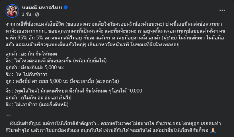 จากประเด็นข่าวเศร้าการจากไปของอินฟูลชื่อดัง แบงค์ เลสเตอร์ ทั้งนี้ทางด้านนักร้องสาว จ๊ะ นงผณี ได้โพสต์เฟสบุ๊กนงผณี มหาดไทย เล่าประสบการณ์เคยมีลูกค้ายื่นแก้วมาให้ดื่มเหล้าเพียวให้หมด โดยเล่าว่า จากกรณีที่น้องแบงค์เสียชีวิต (ขอแสดงความเสียใจกับครอบครัวน้องด้วยนะคะ) ช่วงนี้เลยมีคนส่งข้อความมาหาจ๊ะเยอะมาก