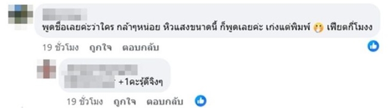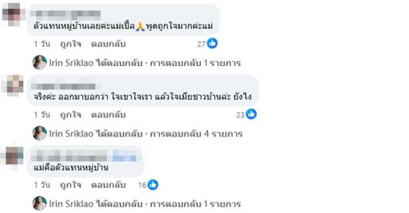 ก่อนที่ในเวลาต่อมา ด้านสาวเปิ้ลไอริณจะเจอชาวเน็ตรายหนึ่งพิมพ์จวกกลับมาว่า พูดชื่อเลยค่ะว่าใคร กล้าๆหน่อย หิวแสงขนาดนี้ ก็พูดเลยค่ะ เก่งแต่พิมพ์ เฟียสกี่โมง ซึ่งด้านสาวเปิ้ลที่เห็นคอมเมนต์ดังกล่าว ก็รีบเข้ามาตอบกลับทันทีเลยว่า ค่ะ รู้ดีจริงๆ ทั้งนี้ ก็ยังมีหลายคอมเมนต์ที่เห็นด้วยกับสิ่งที่สาวเปิ้ลออกมาแสดงความเห็นกันเป็นจำนวนมาก อาทิ แม่คือตัวแทนหมู่บ้าน จริงค่ะ ออกมาบอกว่าใจเขาใจเรา แล้วใจเมียชาวบ้านล่ะ ยังไง เป็นต้น