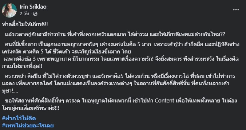 เรียกได้ว่ากลายเป็นดราม่าข้ามปีกันเลยทีเดียว สำหรับ เปิ้ล ไอริณ ที่เมื่อไม่นานมานี้ ได้ออกมาโพสต์ฟาดถึงบุคคลปริศนา ในทำนองว่า ฟาดสื่อไม่ให้เกียรติ ไม่สำรวมกับสามีชาวบ้าน พร้อมกล่าวเพิ่มเติมว่า ศิลปินที่ไม่ได้วางตัว ขอสถานที่ศักดิ์สิทธิ์ควรงดให้เข้าไป