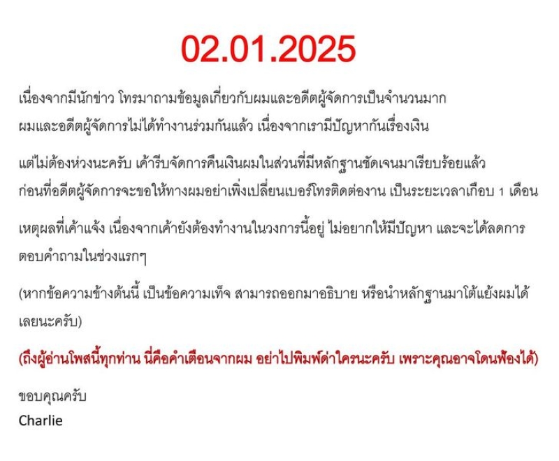ก่อนที่อดีตผู้จัดการจะขอให้ทางผมอย่าเพิ่งเปลี่ยนเบอร์โทรติดต่องาน เป็นระยะเวลา 1 เดือน เหตุผลที่เค้าเเจ้ง เนื่องจากเค้ายังต้องทำงานในวงการนี้อยู่ ไม่อยากมีปัญหา และจะได้ลดการตอบคำถามในช่วงแรกๆ (หากข้อความข้างต้นนี้ เป็นข้อความเท็จ สามารถออกมาอธิบาย หรือนำหลักฐานมาโต้แย้งผมได้เลยนะครับ) (ถึงผู้อ่านโพสนี้ทุกท่าน นี่คือคำเตือนจากผม อย่าไปพิมพ์ด่าใครนะครับ เพราะคุณอาจโดนฟ้องได้) ขอบคุณครับ Charlie
