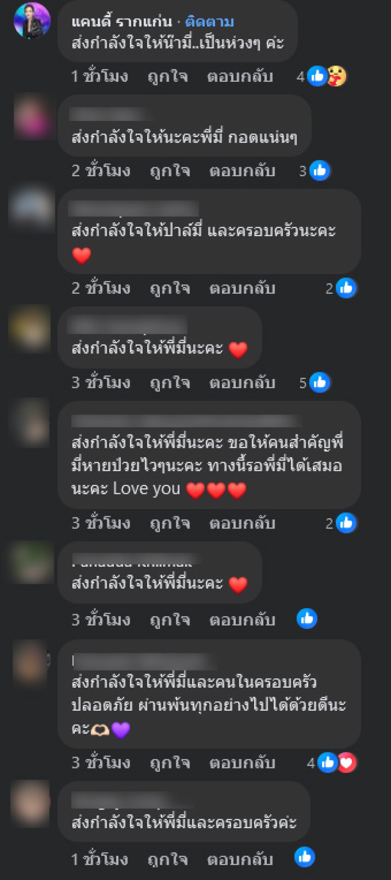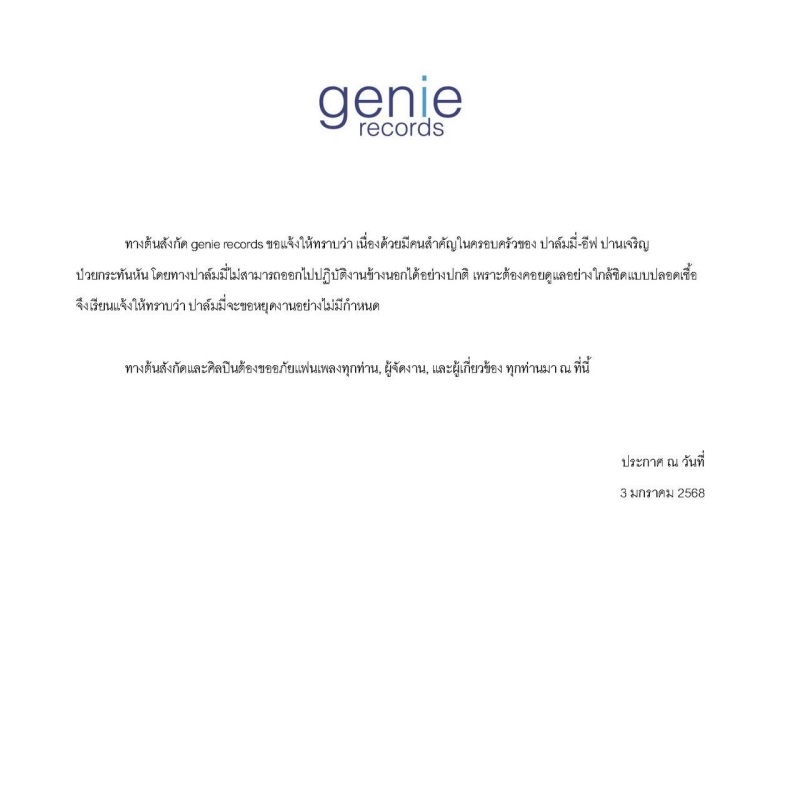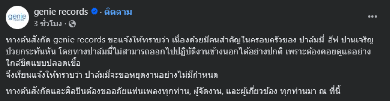 โดยทางปาล์มมี่ไม่สามารถออกไปปฏิบัติงานข้างนอกได้อย่างปกติ เพราะต้องคอยดูแลอย่างใกล้ชิดแบบปลอดเชื้อ จึงเรียนแจ้งให้ทราบว่า ปาล์มมี่จะขอหยุดงานอย่างไม่มีกำหนด ทางต้นสังกัดและศิลปินต้องขออภัยแฟนเพลงทุกท่าน, ผู้จัดงาน, และผู้เกี่ยวข้อง ทุกท่านมา ณ ที่นี้ ท่ามกลางแฟนๆต่างคอมเมนต์ส่งกำลังใจกันอย่างมาก