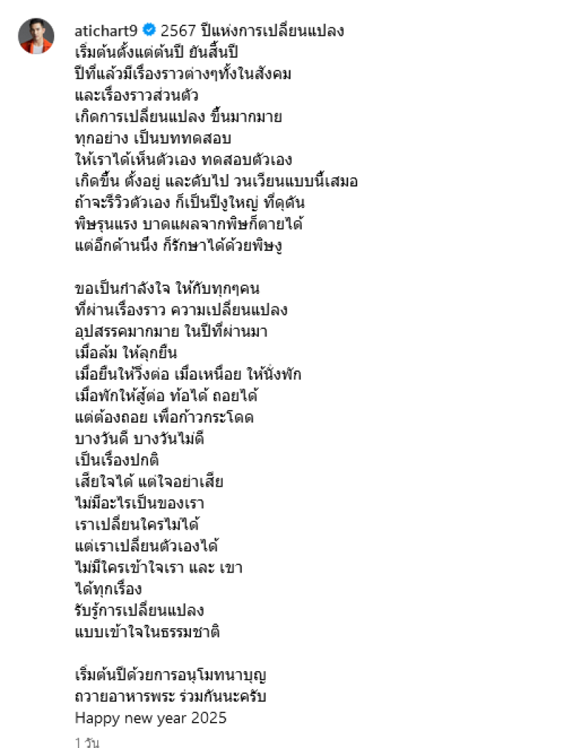 เป็นอีกหนึ่งพระเอกหนุ่มชื่อดังสำหรับ อั้ม อธิชาติ ที่ก่อนหน้านี้ได้เจอมรสุมชีวิตคู่ทำให้ต้องเลิกรากับภรรยา ล่าสุด อั้ม อธิชาติ ได้รีวิวชีวิตในปี 2024 ชีวิตเจอทั้งงูพิษและบททดสอบ แต่พร้อมลุกสู้รับปีใหม่ 2025 โดยได้เล่าผ่านทาง atichart9 ว่า2567 ปีแห่งการเปลี่ยนแปลง เริ่มต้นตั้งแต่ต้นปี ยันสิ้นปี ปีที่แล้วมีเรื่องราวต่างๆทั้งในสังคม และเรื่องราวส่วนตัว เกิดการเปลี่ยนแปลง ขึ้นมากมายทุกอย่าง เป็นบททดสอบ ให้เราได้เห็นตัวเอง ทดสอบตัวเอง