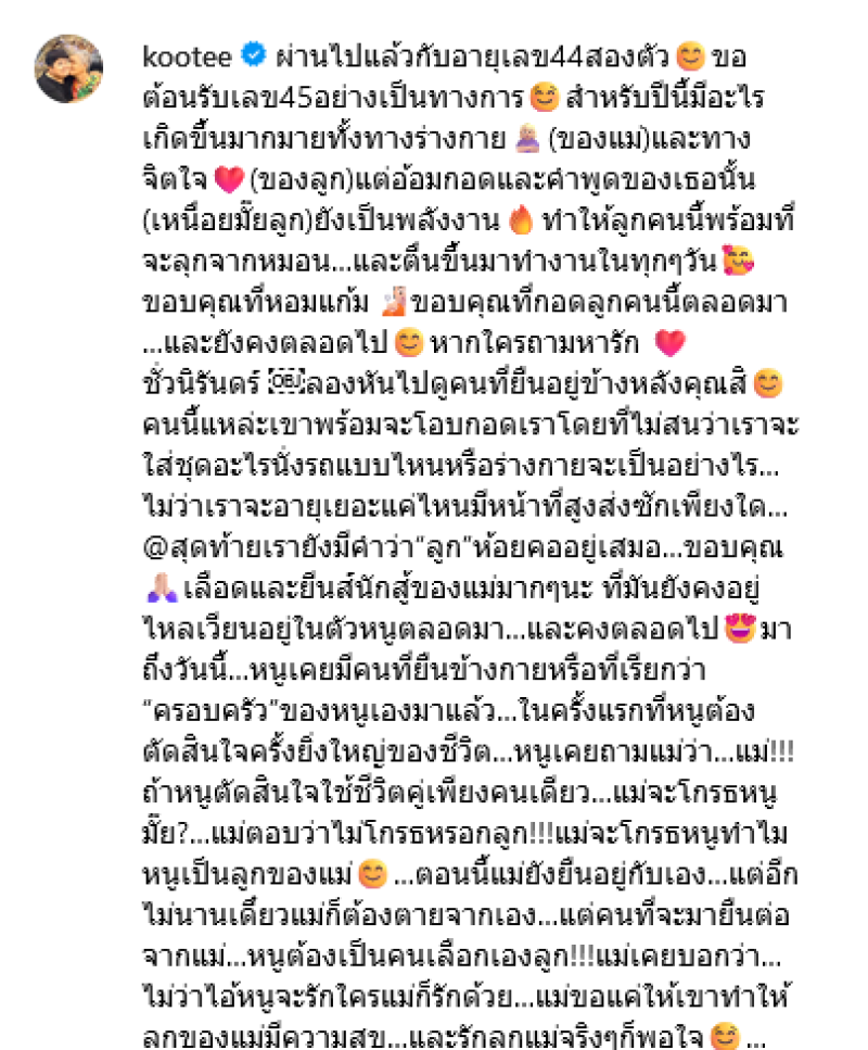 ทั้งนี้ได้ตั้งคำถามว่า ถ้าจะตัดสินใจใช้ชีวิตคู่เพียงคนเดียว ถามว่าแม่จะโกรธหนูมั้ย โดยมีใจความว่า ในครั้งแรกที่หนูต้องตัดสินใจครั้งยิ่งใหญ่ของชีวิต หนูเคยถามแม่ว่า แม่ถ้าหนูตัดสินใจใช้ชีวิตคู่เพียงคนเดียว แม่จะโกรธหนูมั๊ย แม่ตอบว่าไม่โกรธหรอกลูก แม่จะโกรธหนูทำไมหนูเป็นลูกของแม่ตอนนี้แม่ยังยืนอยู่กับเอง แต่อีกไม่นานเดี๋ยวแม่ก็ต้องตายจากเอง แต่คนที่จะมายืนต่อจากแม่ หนูต้องเป็นคนเลือกเองลูก แม่เคยบอกว่าไม่ว่าไอ้หนูจะรักใครแม่ก็รักด้วย