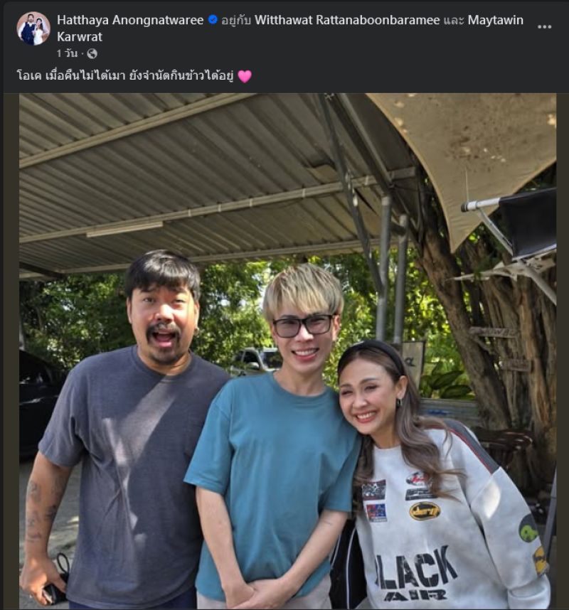 ทั้งนี้ยังได้วิ่งกอดกันทั้งน้ำตา และทางด้าน เนตร ยังได้โพสต์ภาพคู่กับเอม ผ่านทางเฟซบุ๊คส่วนตัวHatthaya Anongnatwaree พร้อมแท็กและเขียนข้อความว่า โอเค เมื่อคืนไม่ได้เมา ยังจำนัดกินข้าวได้อยู่ จากนั้นได้แชร์ความทรงจำเมื่อหลายปีโดยเขียนแคปชั่นว่า แชร์ความทรงจำเก่าๆได้แล้วดิ 55555555
