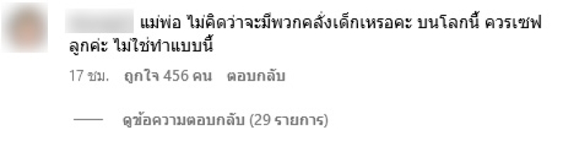 - หลายรูปล่ะนะเอาลูกมาใส่อะไรแบบนี้ลงสื่อ รอบก่อนก็ชุดว่ายน้ำเอามาโพสท่าเซ็กซี่ เราอะเป็นแม่สมัยใหม่นะไม่ได้หัวโบราณ แต่ภาพแบบนี้อะอยากให้คนมองเด็กแบบไหน แล้วมันสมควรหรอเด็กต้องโดนคอมเม้นไปในหลายทิศทางบนสื่ออะ เด็กเขาน่ารักใสซื่อเขาไม่รู้อะไรหรอก เป็นต้น