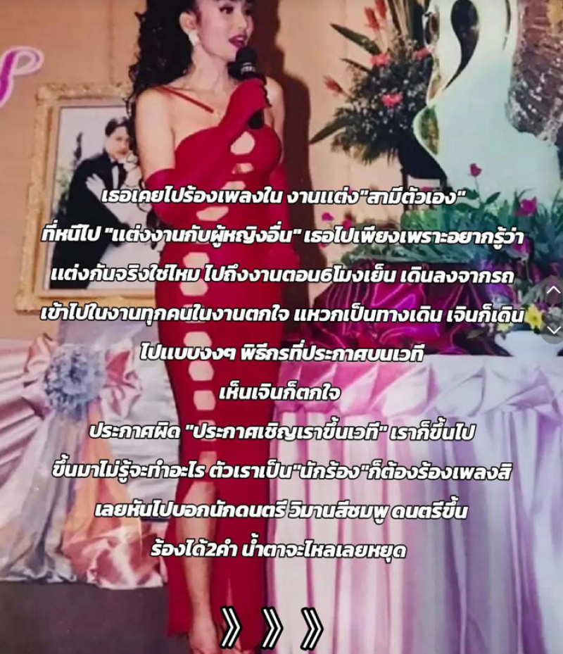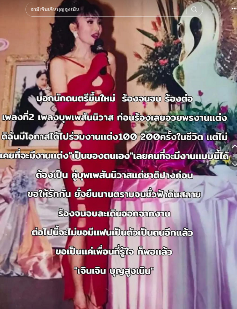 บอกนักดนตรีขึ้นใหม่ ร้องจนจบ ร้องต่อเพลงที่ 2 เพลงบุพเพสันนิวาส ก่อนร้องเลยอวยพรงานแต่ง ดิฉันมีโอกาสได้ไปร่วมงานแต่ง 100 - 200 ครั้งในชีวิต แต่ไม่เคยที่จะมีงานแต่ง เป็นของตนเองเลย คนที่จะมีงานแบบนี้ได้ต้องเป็น คู่บุพเพสันนิวาสแต่ชาติปางก่อนขอให้รักกัน ยั่งยืนนานตราบจนชั่วฟ้าดินสลาย ร้องจนจบ ละเดินออกจากงานต่อไปนี้จะไม่ขอมีแฟนเป็นตัวเป็นตนอีกแล้วขอเป็นแค่เพื่อนที่รู้ใจ ก็พอแล้ว เจินเจิน บุญสูงเนิน
