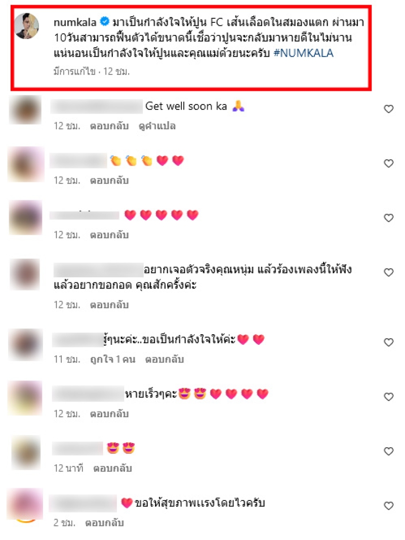 พร้อมเขียนข้อความว่า มาเป็นกำลังใจให้ปูน FC เส้นเลือดในสมองแตก ผ่านมา10วันสามารถฟื้นตัวได้ขนาดนี้เชื่อว่าปูนจะกลับมาหายดีในไม่นานแน่นอนเป็นกำลังใจให้ปูนและคุณแม่ด้วยนะครับ #NUMKALA ท่ามกลางแฟนๆต่างคอมเมนต์ส่งกำลังใจเเละชื่นชมกันอย่างมาก