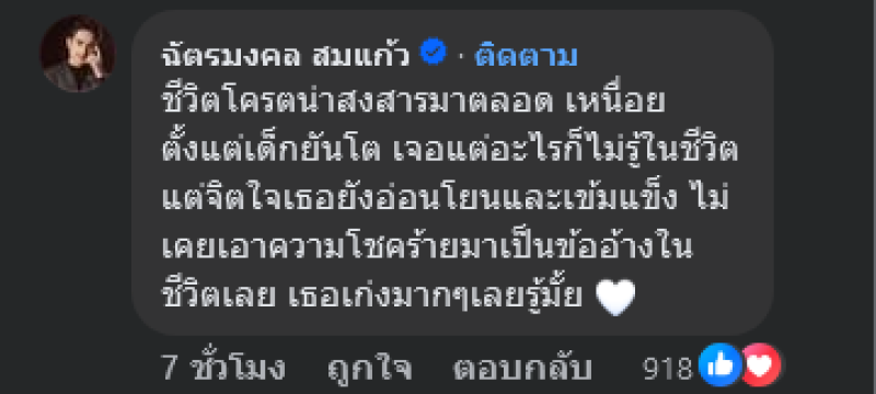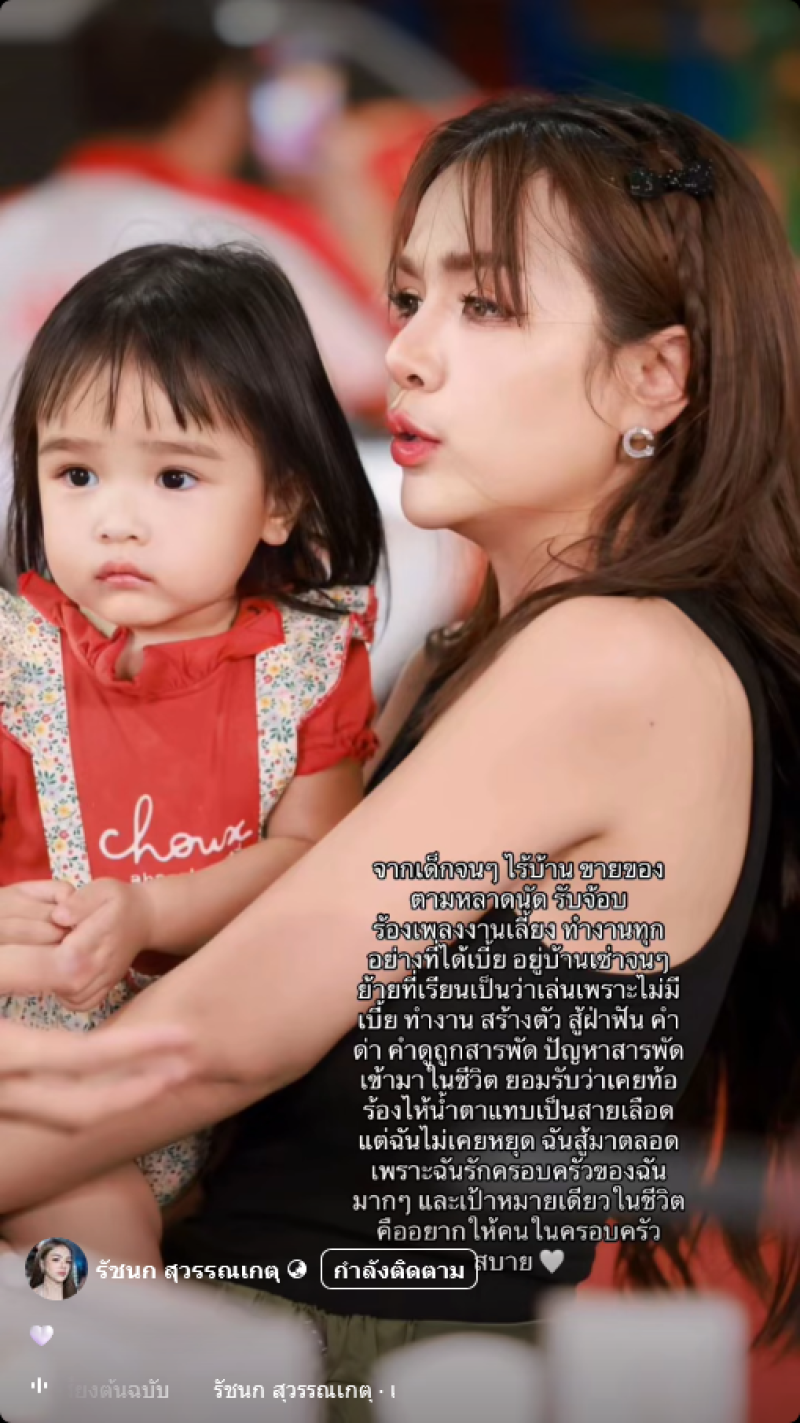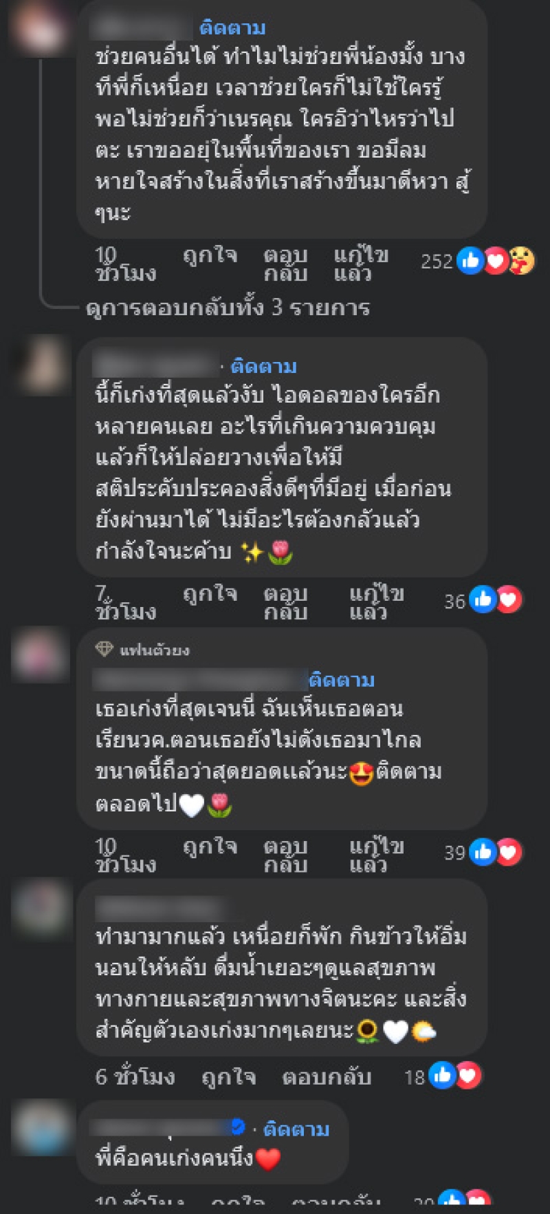 ฉันสู้มาตลอด เพราะฉันรักครอบครัวของฉันมากๆ และเป้าหมายเดียวในชีวิตคืออยากให้คนในครอบครัวสบาย ทั้งนี้ทางด้านสามี ยิว ได้เข้ามาคอมเมนต์ว่า ชีวิตโคตรน่าสงสารมาตลอด เหนื่อยตั้งแต่เด็กยันโต เจอแต่อะไรก็ไม่รู้ในชีวิต แต่จิตใจเธอยังอ่อนโยนและเข้มแข็ง ไม่เคยเอาความโชคร้ายมาเป็นข้ออ้างในชีวิตเลย เธอเก่งมากๆเลยรู้มั้ย ท่ามกลางแฟนๆต่างเข้ามาคอมเมนต์ชื่นชมและส่งกำลังใจ