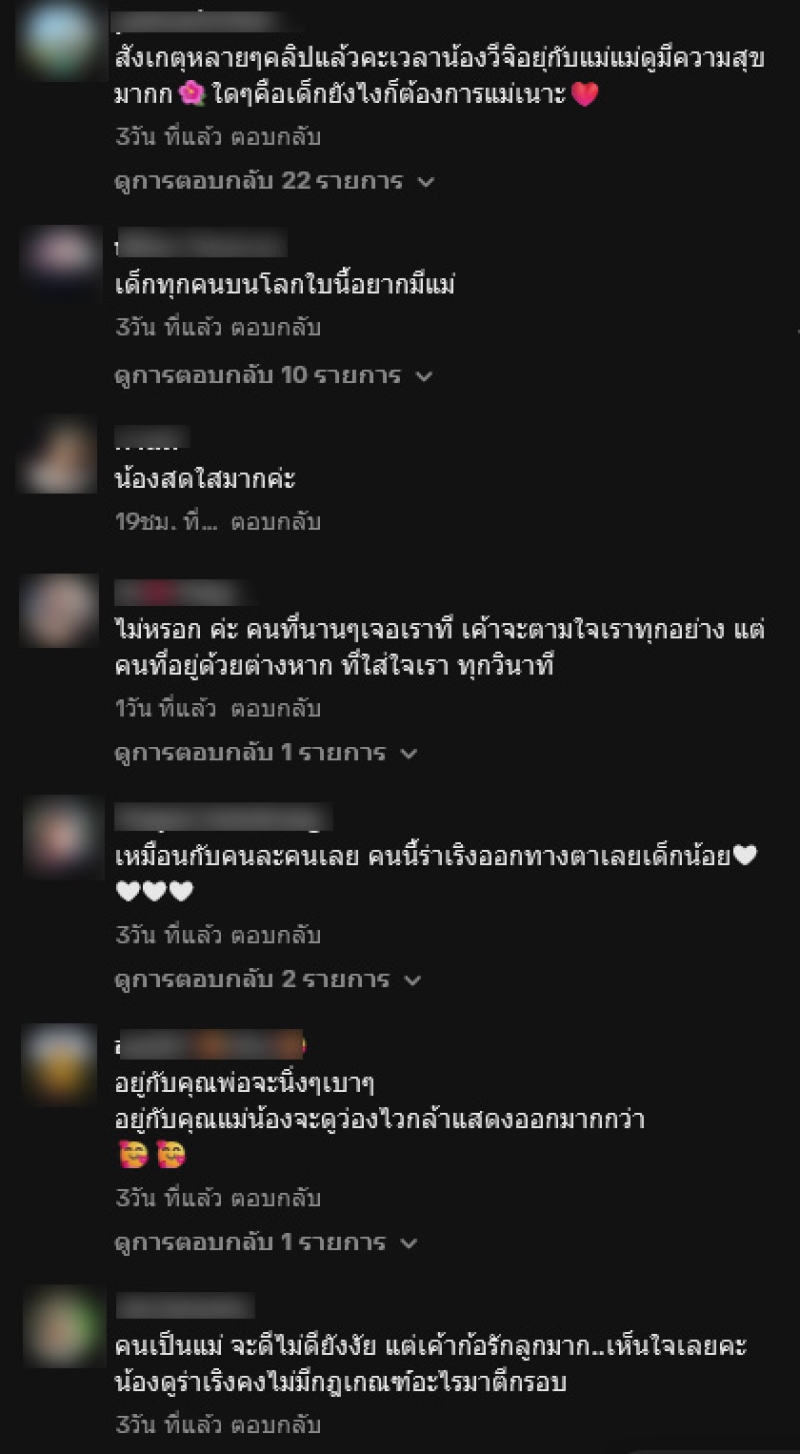 ทั้งนี้ยังได้เขียนแคปชั่นว่า สุขสันต์วัน 2/1/68 ขอขอบพระคุณพี่หนุ่มมากๆนะคะ ขอขอบพระคุณวาที#แม่ลูก#น่ารัก#กุ้งพลอยวีจิ#วีจิ#กุ้งพลอย#ความสุข ท่ามกลางแฟนคลับต่างเข้ามาคอมเมนต์ชื่นชมกันอย่างมาก อาทิ สังเกตุหลายๆคลิปแล้วคะเวลาน้องวีจิอยุ่กับแม่แม่ดูมีความสุขมาก ใดๆคือเด็กยังไงก็ต้องการแม่เนาะ,เด็กทุกคนบนโลกใบนี้อยากมีแม่,น้องสดใสมากค่ะ เป็นต้น