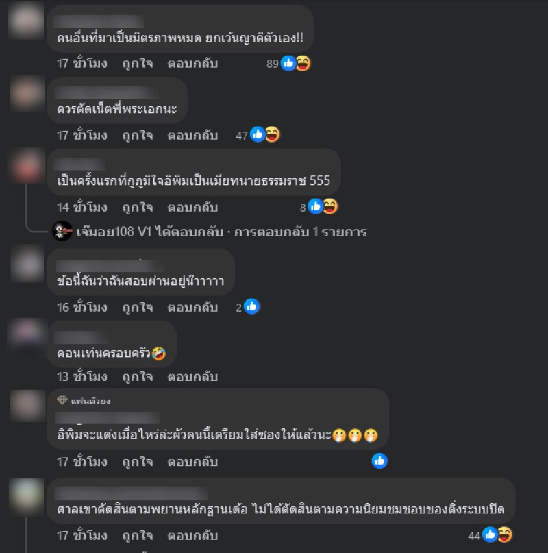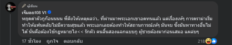 ทั้งนี้ยังได้คอมเมนต์ใต้โพสต์เพิ่มเติมอีกว่า หยุดด่าผัวxูก๊อนนนน พี่คิงให้เหตุผลว่า.. ที่ผ่านมาพระเอกเขาอดทนแล้ว แต่เรื่องเห้ๆ การดราม่าเริ่มทำให้แฟนคลับไม่มีความสุขแล้ว พระเอกเลยต้องทำให้สถานการณ์เห้ๆ มันจบ ซึ่งมันหาทางอื่นไม่ได้ นั่นคือต้องใช้กฎหมายไง รักผัว คนลิ้นสองแฉกแบบxู ผู้ชายต้องมาก่อนเสมอ แผล่บๆ