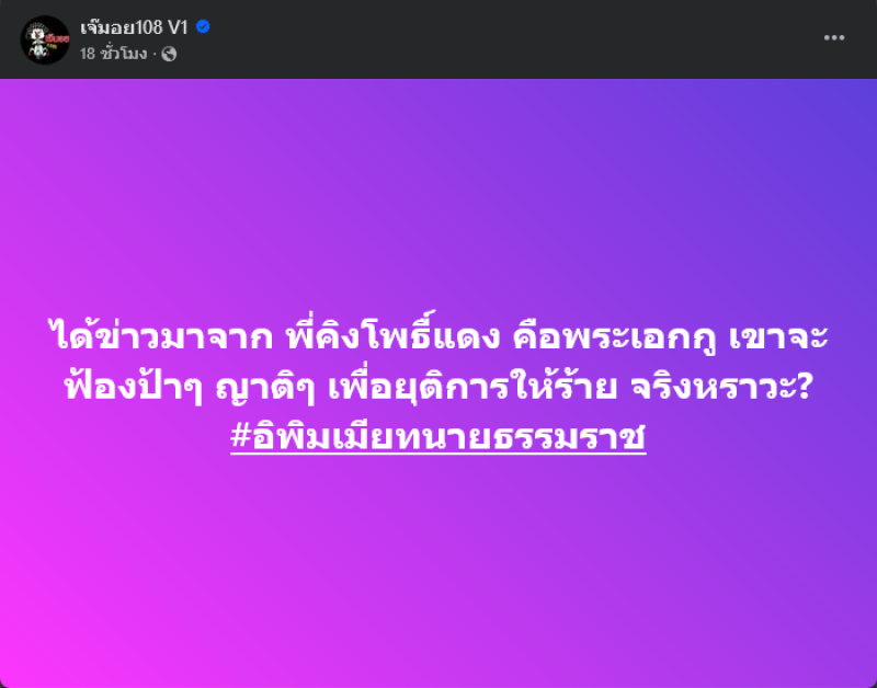 เรียกได้ว่ามีประเด็นของวงการบันเทิงไม่หยุดจริงๆเมื่อทางด้านเพจ เจ๊มอย108 V1 ได้ออกมาโพสต์เปิดประเด็นเรื่องราวของพระเอกหนุ่ม โดยโพสต์ข้อความว่า ได้ข่าวมาจาก พี่คิงโพธื์แดง คือพระเอกxู เขาจะฟ้องป้าๆ ญาติๆ เพื่อยุติการให้ร้าย จริงหราวะ? #อิพิมเมียทนายธรรมราช งานนี้เอาทำชาวเน็ตต่างเข้ามาคอมเมนต์กันอย่างมาก