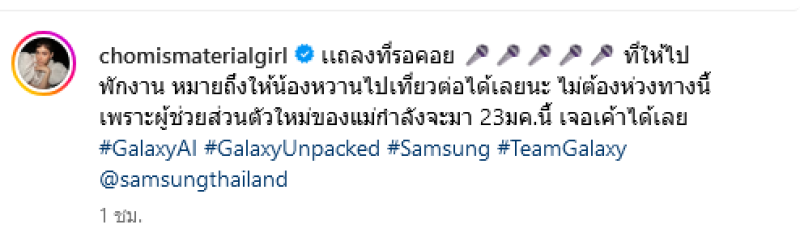 ล่าสุดทางด้าน ชมพู่ อารยา ได้ออกมาเฉลยผ่านทางอินสตาแกรม chomismaterialgirl ระบุว่า เเถลงที่รอคอย ที่ให้ไปพักงาน หมายถึงให้น้องหวานไปเที่ยวต่อได้เลยนะ ไม่ต้องห่วงทางนี้ เพราะผู้ช่วยส่วนตัวใหม่ของแม่กำลังจะมา 23 มค.นี้ เจอเค้าได้เลย #GalaxyAI #GalaxyUnpacked #Samsung #TeamGalaxy @samsungthailand โดยคลิปโฆษณาเมื่อ หวานเจี๊ยบ แจ้งลาสาวชมพู่ว่า ไปเกาหลีก่อนอีก 2 เดือนเจอกัน