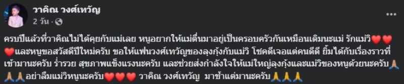 ล่าสุด ด้านลูกชายตัวน้อยของวิรดา ได้ออกมาเคลื่อนไหวผ่านโซเชียล พร้อมระบุแคปชั่น ดังนี้ว่า ครบปีแล้ว ที่วาคิณไม่ได้คุยกับแม่เลย หนูอยากให้แม่ตื่นมายอยู่เป็นครอบครัวของกันเหมือนเดิมนะแม่ รักแม่วิ เรียกได้ว่าทำบีบหัวใจคนอ่านกันเลยทีเดียว ซึ่งในเวลาต่อมา ด้านชาวเน็ตต่างพากันเข้ามาให้กำลังใจน้องวาคิณกันอย่างล้นหลาม อาทิ เอ็นดูหนูนะครับวาคิณคนเก่ง น้องวาคิณต้องเก่งเหมือนแม่และลุงนะคะ ขอให้แม่หายไวๆค่ะ เป็นต้น
