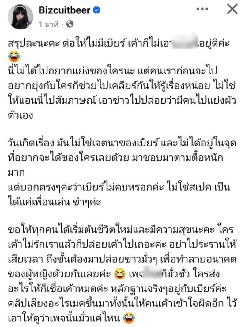 สรุปละนะคะ ต่อให้ไม่มีเบียร์ เค้าก็ไม่เอาXXอยู่ดีค่ะ ทั้งนี้ทางด้านโพสต์ของ เบียร์ ได้เขียนว่า นี่ไม่ได้ไปอยากแย่งของใครนะ คนเราก่อนจะไปอยากยุ่งกับใครก็ช่วยไปเคลียร์กันให้รู้เรื่องหน่อย ไม่ใช่ให้xxไปสัมภาษณ์ เอาข่าวไปปล่อยว่ามีคนไปแย่งผัวตัวเอง วันเกิดเรื่องมันไม่ใช่เจตนาของเบียร์ และไม่ได้อยู่ในจุดที่อยากจะได้ของใครเลยด้วย มาชอบมาตามตื้อหนักมาก แต่บอกตรงๆค่ะว่าเบียร์ไม่คบหรอกค่ะ ไม่ใช่สเปค เป็นได้แค่เพื่อนเล่นขำๆค่ะ เค้าไม่รักเราแล้วก็ปล่อยเค้าไปเถอะค่ะ อย่าไประรานให้เสียเวลา