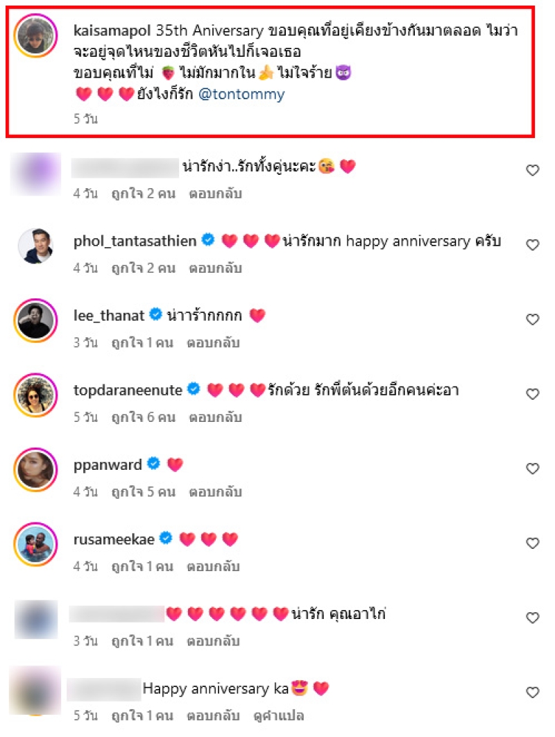 พร้อมเขียนแคปชั่นว่า 35th Aniversary ขอบคุณที่อยู่เคียงข้างกันมาตลอด ไม่ว่าจะอยู่จุดไหนของชีวิตหันไปก็เจอเธอ ขอบคุณที่ไม่ (อิโมจิสตรอว์เบอรี่) ไม่มักมากใน (อิโมจิกล้วย) ไม่ใจร้าย (อิโมจิหน้าดุ) ยังไงก็รัก @tontommy ท่ามกลางแฟนๆและเพื่อนในวงการต่างเข้ามาคอมเมนต์แซวกันอย่างมาก