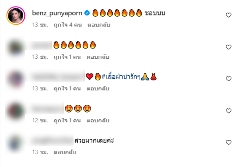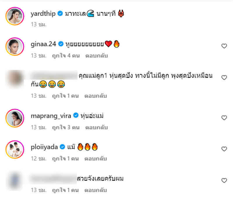 ท่ามกลาง เพื่อนๆในวงการบันเทิง และแฟนๆก็ได้เข้ามาคอมเมนต์กันจำนวนมาก อาทิ คุณแม่ลูก1 หุ่นสุดปัง ทางนี้ไม่มีลูก พุงสุดปังเหมือนกัน,หูยยยยยยยยย,สวยจังเลยครับผม, กลับมาเล่นละครให้ FC ดูได้แล้ว คิดถึง, แซบมากกกแม่ เป็นต้น