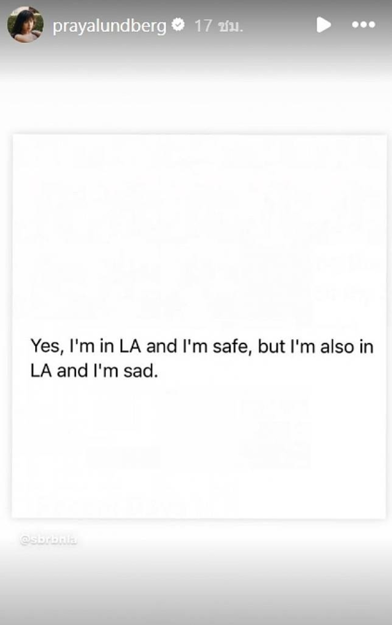 ล่าสุดทางด้าน ปู ไปรยา ได้เคลื่อนไหวอัปเดตสถานการณ์ผ่านทางสตอรี่อินสตาแกรม prayalundberg เผยว่า Yes, I'm in LA and I'm safe, but I'm also in LA and I am sad' ยืนยันว่าปลอดภัย แต่เศร้ากับเหตุการณ์ครั้งนี้อย่างมาก ท่ามกลางแฟนๆ แห่ส่งกำลังใจให้ล้นหลาม ขอให้ทุกคนที่ได้รับผลกระทบผ่านพ้นวิกฤตนี้ไปได้อย่างปลอดภัยค่ะ
