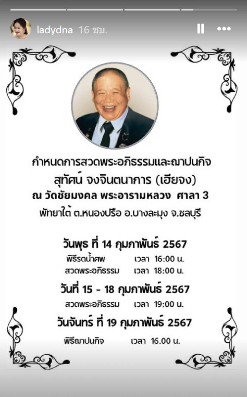 ต้องขออภัยจริงๆ ที่แจ้งช้านะคะ วันอาทิตย์ที่ 18 ก.พ.67 วันสุดท้ายแล้ว ไม่ต้องส่งหรีดนะ แค่ส่งกำลังใจมาให้ก็พอ เรียนเชิญทุกท่านที่อยากจะส่ง 'เฮียจง' เป็นครั้งสุดท้าย วันจันทร์ที่ 19 ก.พ.นี้ นะคะ