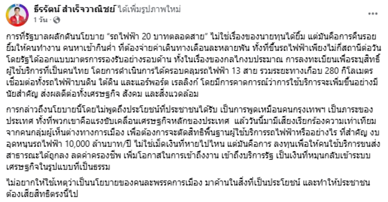 เมื่อวันที่ 13 กรกฎาคม 2568 นางสาวธีรรัตน์ สำเร็จวาณิชย์ รัฐมนตรีช่วยว่าการกระทรวงมหาดไทย ได้โพสต์ข้อความบนเฟซบุ๊กตอบโต้กระแสวิพากษ์วิจารณ์เกี่ยวกับนโยบาย รถไฟฟ้า 20 บาทตลอดสาย” ที่มีบางฝ่ายกล่าวว่าเป็นนโยบายเอื้อประโยชน์ต่อนายทุน โดยยืนยันว่านโยบายนี้เกิดขึ้นเพื่อบรรเทาภาระค่าครองชีพของประชาชนผู้ใช้แรงงานในเมือง และถือเป็นการคืนรอยยิ้มให้กับคนหาเช้ากินค่ำ ไม่ใช่เพื่อผลประโยชน์ของนายทุนตามที่มีการวิจารณ์