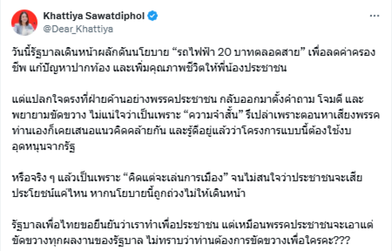 ในประเด็นเดียวกัน นางสาวขัตติยา สวัสดิผล ส.ส.บัญชีรายชื่อ และรองโฆษกพรรคเพื่อไทย ก็ได้โพสต์ข้อความผ่านแพลตฟอร์ม X แสดงความไม่เข้าใจต่อท่าทีของพรรคประชาชนที่ออกมาตั้งคำถามและโจมตีนโยบายนี้ ทั้งที่พรรคตนเองก็เคยเสนอแนวคิดลักษณะเดียวกันในช่วงการหาเสียง