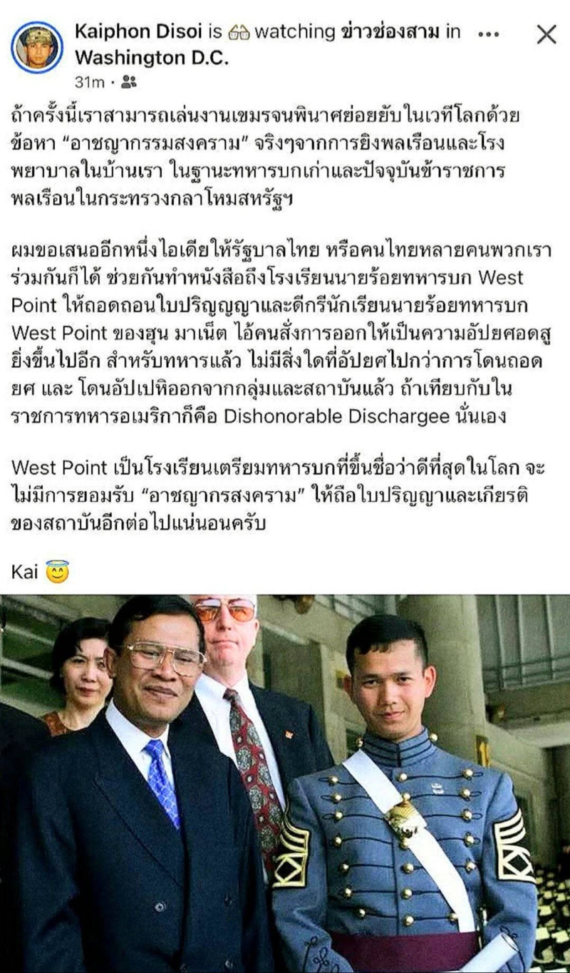ล่าสุด บนโลกโซเชียลมีการเรียกร้องให้ถอดยศ พล.อ. ฮุน มาเนต (Hun Manet) นายกรัฐมนตรีกัมพูชาคนปัจจุบัน โดยเนื้อหาระบุว่า ถ้าครั้งนี้เราสามารถเล่นงานเขมรจนพินาศย่อยยับในเวทีโลกด้วยข้อหา อาชญากรรมสงคราม จริงๆ จากการยิงพลเรือนและโรงพยาบาลในบ้านเรา ในฐานะทหารบกเก่าและปัจจุบันข้าราชการพลเรือนในกระทรวงกลาโหมสหรัฐฯ