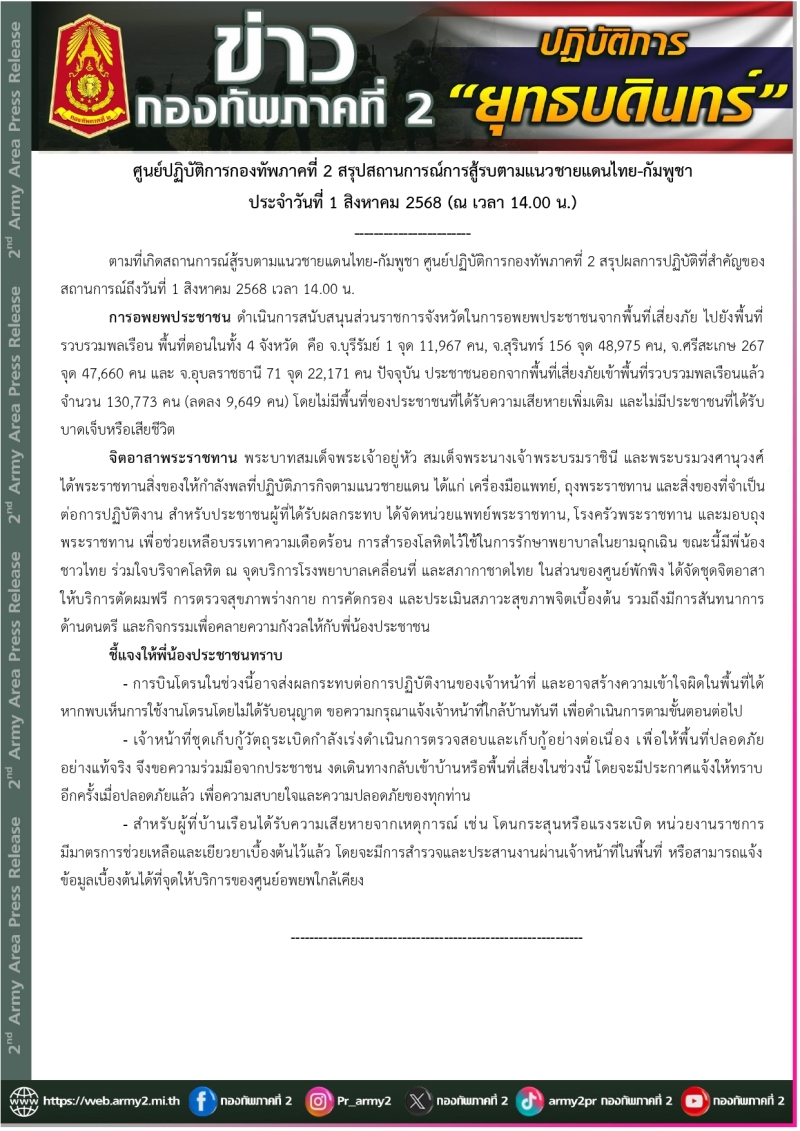 ศูนย์ปฏิบัติการกองทัพภาคที่ 2 สรุปสถานการณ์การสู้รบตามแนวชายแดนไทย-กัมพูชา ประจำวันที่ 1 สิงหาคม 2568 (ณ เวลา 14.00 น.) ตามที่เกิดสถานการณ์สู้รบตามแนวชายแดนไทย-กัมพูชา ศูนย์ปฏิบัติการกองทัพภาคที่ 2 สรุปผลการปฏิบัติที่สำคัญของสถานการณ์ถึงวันที่ 1 สิงหาคม 2568 เวลา 14.00 น.