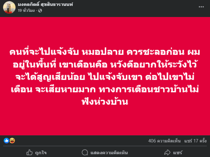 ล่าสุด เต้ มงคลกิตติ์ สุขสินธารานนท์ ได้ออกมาโพสต์ผ่านเฟสบุ๊คส่วนตัว มงคลกิตติ์ สุขสินธารานนท์ แสดงจุดยืนปกป้องหมอปลาย โดยระบุว่า "คนที่จะไปแจ้งจับหมอปลาย ควรชะลอก่อน ผมอยู่ในพื้นที่ เขาเตือนคือหวังดี อยากให้ระวังไว้ จะได้สูญเสียน้อย ไปแจ้งจับเขา ต่อไปเขาไม่เตือน จะเสียหายมาก ทางการเตือนชาวบ้านไม่ฟังห่วงบ้าน"