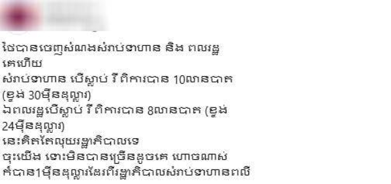 ข้อความบางช่วงในโพสต์ระบุว่า "ไทยได้จ่ายเงินชดเชยให้กับทหารและพลเรือนแล้ว... แล้วพวกเรา ถึงแม้จะไม่ได้มากเท่าเขา อย่างน้อยก็ยังควรได้รับสัก 10,000 ดอลลาร์ จากรัฐบาล สำหรับทหารที่เสียชีวิต"