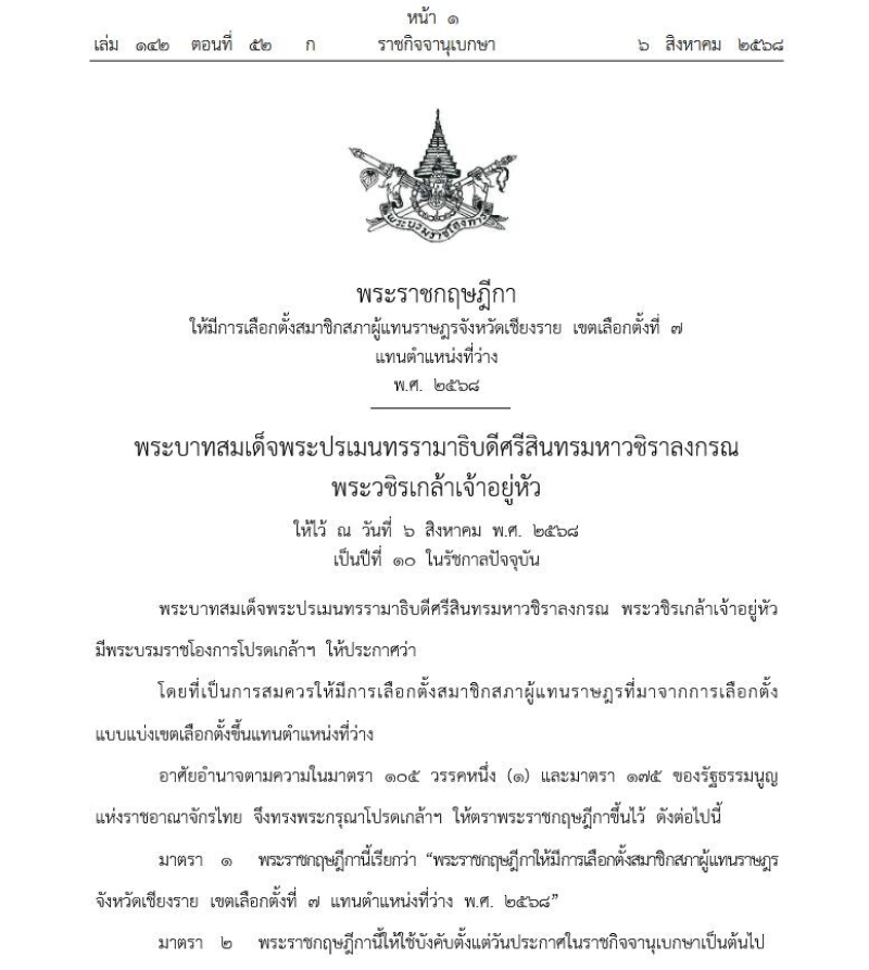ราชกิจจานุเบกษาเผยแพร่พระราชกฤษฎีกา เมื่อวันที่ 6 สิงหาคม 2568 ให้มีการเลือกตั้งสมาชิกสภาผู้แทนราษฎร จังหวัดเชียงราย เขตเลือกตั้งที่ 7 แทนตำแหน่งที่ว่าง ซึ่งพระบาทสมเด็จพระวชิรเกล้าเจ้าอยู่หัว ได้ทรงพระกรุณาโปรดเกล้าฯ ให้ตราพระราชกฤษฎีกาฉบับนี้ ตามอำนาจแห่งรัฐธรรมนูญมาตรา 105 วรรคหนึ่ง (1) และมาตรา 175