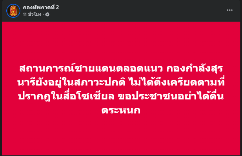 สถานการณ์ชายแดนตลอดแนว กองกำลังสุรนารียังอยู่ในสภาวะปกติ ไม่ได้ตึงเครียดตามที่ปรากฏในสื่อโซเชียล ขอประชาชนอย่าได้ตื่นตระหนก