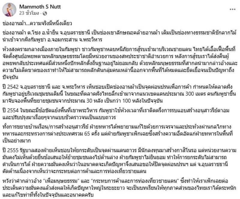 เมื่อวันที่ 20 สิงหาคม 2568 พลตรีณัฏฐ์ ศรีอินทร์ รองแม่ทัพภาคที่ 2 ได้โพสต์ข้อความผ่านเฟซบุ๊กส่วนตัว Mammoth S Nutt เปิดเผยเบื้องหลังสถานการณ์บริเวณ ช่องอานม้า ตำบลโซง อำเภอน้ำยืน จังหวัดอุบลราชธานี โดยระบุว่า จุดนี้เคยเป็นเส้นทางลำเลียงไม้จากฝั่งกัมพูชาในอดีต ก่อนจะกลายเป็นพื้นที่พักพิงของผู้อพยพ และต่อมาขยายกลายเป็นชุมชนถาวร