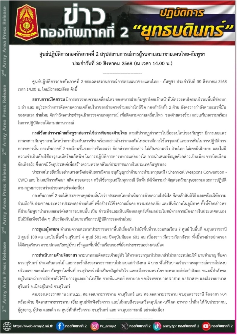 เมื่อวันที่ 30 สิงหาคม 2568 เวลา 14.00 น. ศูนย์ปฏิบัติการกองทัพภาคที่ 2 ได้ออกแถลงการณ์ผ่านเพจเฟซบุ๊ก กองทัพภาคที่ 2 เกี่ยวกับ สถานการณ์ตามแนวชายแดนไทย - กัมพูชา โดยมีเนื้อหาสำคัญเกี่ยวกับความเคลื่อนไหวล่าสุดของทหารฝ่ายกัมพูชา รวมถึงการตอบโต้ข่าวเท็จที่ถูกเผยแพร่ในสื่อกัมพูชา