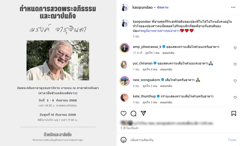 ล่าสุด ทางนักแสดงรุ่นใหญ่และเป็นน้องสาว อย่าง ดวงดาว จารุจินดา ได้โพสต์ภาพพร้อมเขียนเเคปชั่นว่า พี่ชายสุดที่รักเชฟมิชลินของน้องพี่ไม่ได้ไปไหนยังคงอยู่ในหัวใจของน้องสาวคนนี้ตลอดไปรักลุงเล็กที่สุดพี่ชายที่แสนดีของน้อง#ดญมียาหลานสาวคุณย่าดาว