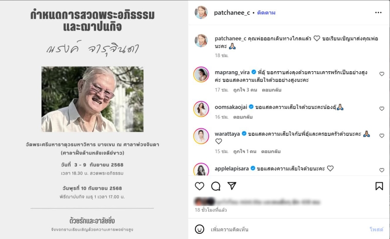 จากกรณีที่ก่อนหน้านั้น ได้มีข่าวเศร้าสำหรับวงการบันเทิงไทย เมื่อทาง อุ๊-พัชนี จารุจินดา ได้โพสต์แจ้งข่าวเศร้าผ่านอินสตาแกรมว่า คุณพ่อออกเดินทางไกลแล้ว ขอเรียนเชิญมาส่งคุณพ่อนะคะ