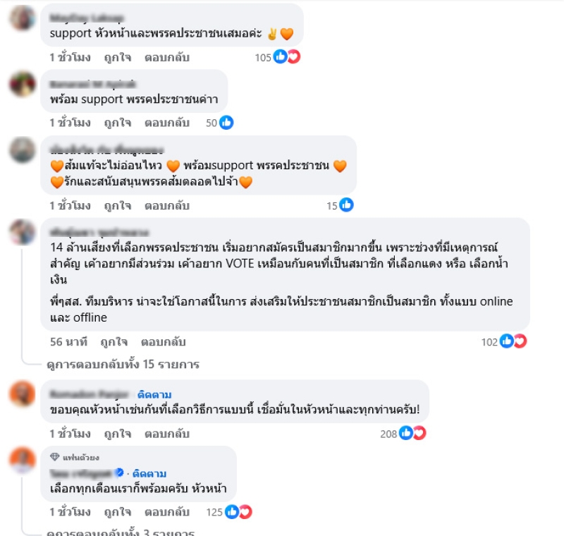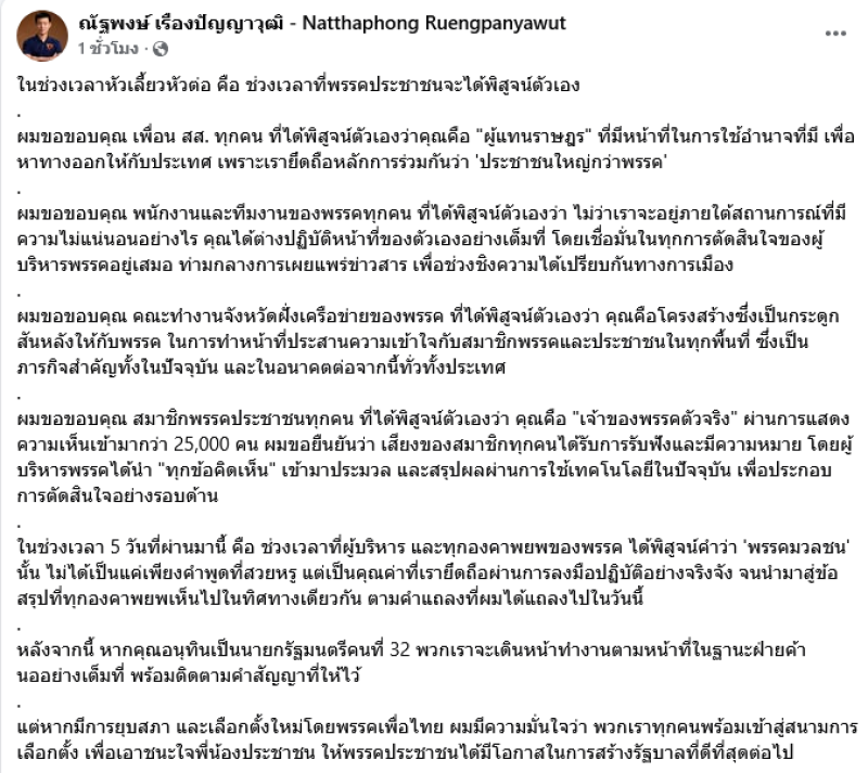 ผมขอขอบคุณ สมาชิกพรรคประชาชนทุกคน ที่ได้พิสูจน์ตัวเองว่า คุณคือ เจ้าของพรรคตัวจริง ผ่านการแสดงความเห็นเข้ามากว่า 25,000 คน ผมขอยืนยันว่า เสียงของสมาชิกทุกคนได้รับการรับฟังและมีความหมาย โดยผู้บริหารพรรคได้นำ ทุกข้อคิดเห็น เข้ามาประมวล และสรุปผลผ่านการใช้เทคโนโลยีในปัจจุบัน เพื่อประกอบการตัดสินใจอย่างรอบด้าน