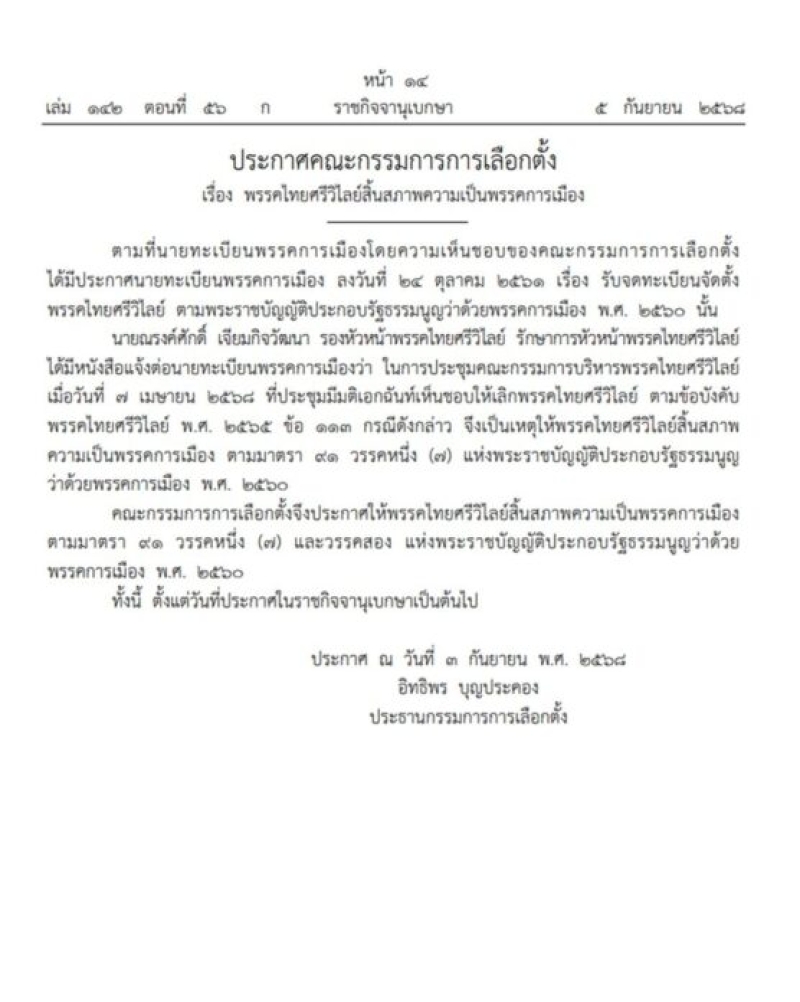 วันที่ 5 กันยายน 2568 เว็บไซต์ราชกิจจานุเบกษาเผยแพร่ ประกาศคณะกรรมการการเลือกตั้ง เรื่อง พรรคไทยศรีวิไลย์สิ้นสภาพความเป็นพรรคการเมือง ตามบทบัญญัติแห่งพระราชบัญญัติประกอบรัฐธรรมนูญว่าด้วยพรรคการเมือง พ.ศ. 2560