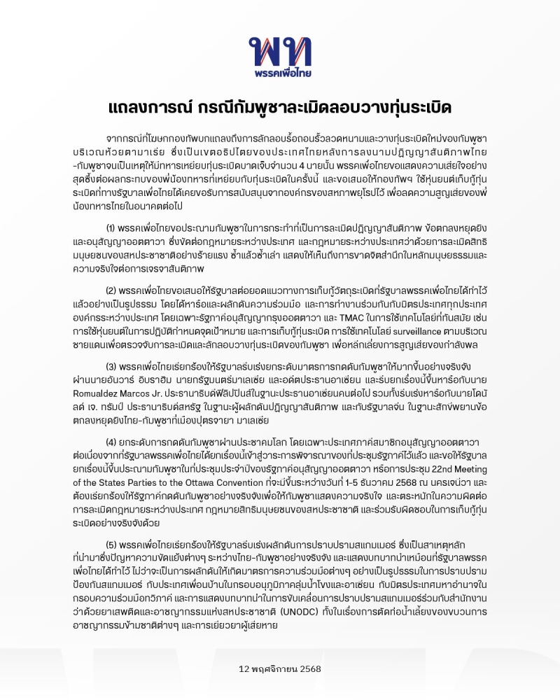 เมื่อเวลา 11.00 น. วันที่ 12 พฤศจิกายน 2568 ที่พรรคเพื่อไทย นายมาริษ เสงี่ยมพงษ์ อดีตรัฐมนตรีว่าการกระทรวงการต่างประเทศ และนายกฤชนนท์ อัยยปัญญา รองโฆษกพรรคเพื่อไทย ร่วมกันแถลงข่าวถึงสถานการณ์บริเวณชายแดนไทย-กัมพูชา ภายหลังเกิดเหตุทหารไทยได้รับบาดเจ็บจากการเหยียบทุ่นระเบิด บริเวณห้วยตามาเรีย พื้นที่ชายแดนไทย หลังจากมีรายงานว่าฝ่ายกัมพูชาลักลอบรื้อรั้วลวดหนามและวางทุ่นระเบิดใหม่ในเขตอธิปไตยของไทย
