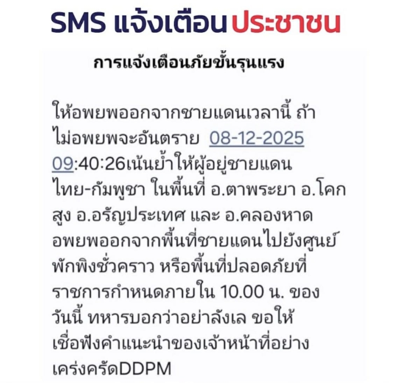 สถานการณ์ตามแนวชายแดนไทย-กัมพูชากลับมาน่าวิตกอีกครั้ง หลังมีการส่ง SMS แจ้งเตือนภัยฉุกเฉินระดับรุนแรงถึงประชาชนในพื้นที่เสี่ยง เมื่อช่วงเช้าที่ผ่านมา กำชับให้รีบออกจากพื้นที่ทันที เพื่อความปลอดภัยสูงสุด