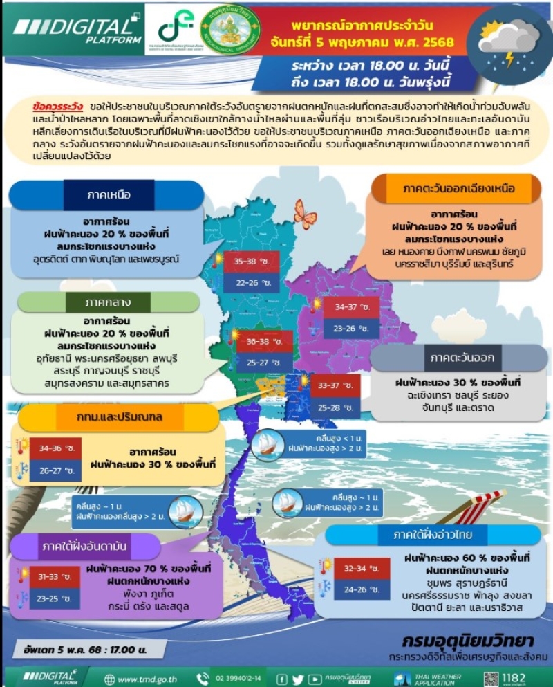 พยากรณ์อากาศประจําวัน จันทร์ที่ 5 พฤษภาคม พ.ศ. 2568 ระหว่าง เวลา 18.00 น. วันนี้ ถึง เวลา 18.00 น. วันพรุ่งนี้