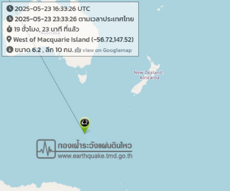ขณะที่ผลการตรวจเช็กแผ่นดินไหวทั่วโลกเรียกว่าใช้รหัสแดงได้เลย เกิดขึ้นที่ West of Macquarie Island ขนาดความสั่นมากถึง 6.2 แมกนีจูด ห่างจากประเทศไทยอยู่ที่ 8,954 กิโลเมตร