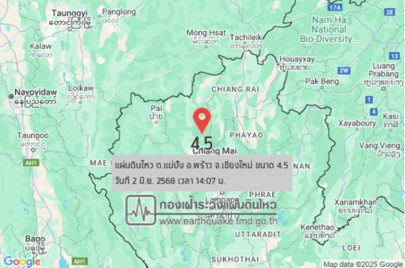 กองเฝ้าระวังแผ่นดินไหวประเทศไทย ได้ออกมาเปิดข้อมูลที่เก็บบันทึกการเกิดเหตุแผ่นดินไหวให้ทราบกันของ วันที่ 2 มิถุนายน 2568 ที่ ต.แม่ปั๋ง อ.พร้าว จ.เชียงใหม่