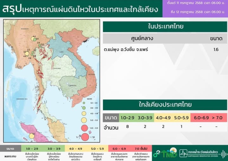 โดยก่อนหน้านี้กองเฝ้าระวังแผ่นดินไหว กรมอุตุนิยมวิทยา ได้สรุปเหตุการณ์แผ่นดินไหวในประเทศและใกล้เคียง ตั้งแต่วันที่ 11 กรกฎาคม 2568 เวลา 06.00 น. ถึง วันที่ 12 กรกฎาคม 2568 เวลา 06.00 น.