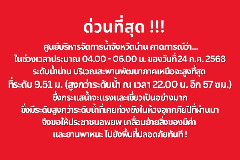 วันที่ 24 กรกฎาคม 2568 กรมประชาสัมพันธ์ แจ้งเตือนด่วนจาก ศูนย์บริหารจัดการน้ำจังหวัดน่าน คาดการณ์ว่าในช่วงเวลาประมาณ 04.00 - 06.00 น. ระดับน้ำแม่น้ำน่านบริเวณสะพานพัฒนาภาคเหนือจะพุ่งขึ้นแตะ 9.51 เมตรซึ่งสูงกว่าระดับน้ำเมื่อคืนเวลา 22.00 น. ถึง57 เซนติเมตร โดยกระแสน้ำจะแรงและเชี่ยวจัด อาจเกินจุดที่เคยท่วมในช่วงอุทกภัยครั้งใหญ่ก่อนหน้านี้