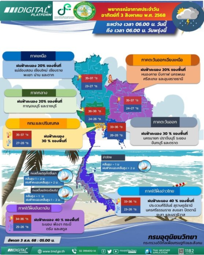 ในวันที่ 3 สิงหาคม 2568 กรมอุตุนิยมวิทยาแจ้งว่า ประเทศไทยตอนบนมีแนวโน้มฝนตกน้อย เนื่องจากมรสุมตะวันตกเฉียงใต้ที่พัดปกคลุมทะเลอันดามัน ประเทศไทย และอ่าวไทย มีกำลังอ่อน ขณะเดียวกันมีหย่อมความกดอากาศต่ำปกคลุมบริเวณตอนบนของประเทศเวียดนามและอ่าวตังเกี๋ย