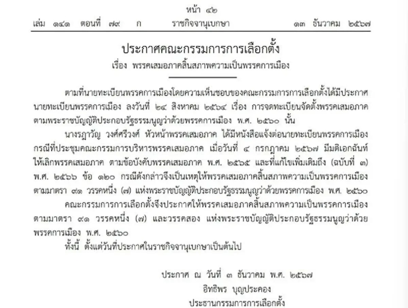 วันที่ 13 ธันวาคม 2567 เว็บไซต์ ราชกิจจานุเบกษา เผยแพร่ ประกาศคณะกรรมการการเลือกตั้ง เรื่อง พรรคเสมอภาค สิ้นสภาพความเป็นพรรคการเมือง ตามที่นายทะเบียนพรรคการเมืองโดยความเห็นชอบของคณะกรรมการการเลือกตั้ง ได้มีประกาศนายทะเบียนพรรคการเมือง ลงวันที่ 24 สิงหาคม 2564 เรื่อง การจดทะเบียนจัดตั้งพรรคเสมอภาค ตามพระราชบัญญัติประกอบรัฐธรรมนูญว่าด้วยพรรคการเมือง พ.ศ. 2560 นั้น