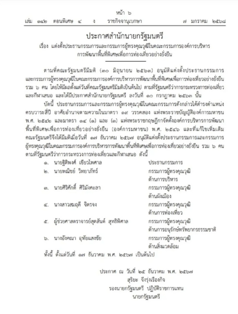 เว็บไซต์ ราชกิจจานุเบกษา เผยแพร่ ประกาศสำนักนายกรัฐมนตรี เรื่อง การแต่งตั้งประธานกรรมการและกรรมการผู้ทรงคุณวุฒิในคณะกรรมการองค์การบริหารการพัฒนาพื้นที่พิเศษเพื่อการท่องเที่ยวอย่างยั่งยืน รวม 6 คน